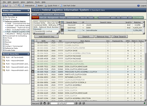 When you know exactly what fields you want to search, use the Classic Plus interface to build a visual query by specifying the indexed fields to be searched, the values to be found, and how to combine (and/or) those queries. It includes technical characteristic searching, and automatically combines (cross references) data from many sources so that you get your data with less effort.  Advanced features include using index values from one database to search another (for example using Procurement keys in a FLIS search), and the support for "Greater Than", "Greater Than or Equal To", "Less Than", "Less Than or Equal To", "Not Equal To" and "Range" comparisons.