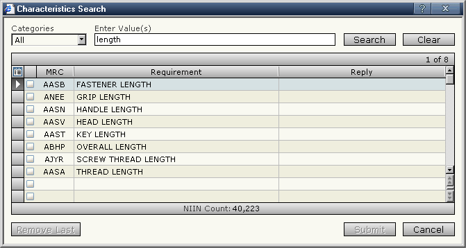 The next step is to click the key list entry "Characteristic Lookup" to enter into the Characteristic Sub-Search dialog.  All 95 relevant MRCs are displayed.  Filtering the list for MRCs related to "Length" reduces its size to a more manageable number of entries.